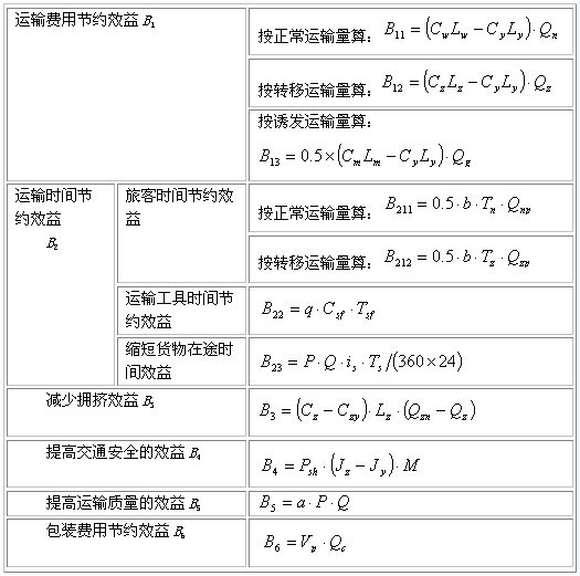 ■效益:表現(xiàn)為所設(shè)計(jì)的運(yùn)輸系統(tǒng)在客貨運(yùn)輸過(guò)程中發(fā)生的各種運(yùn)輸費(fèi)用的節(jié)約、運(yùn)輸時(shí)間的節(jié)約、擁擠程度的緩解、運(yùn)輸質(zhì)量的提高、包裝費(fèi)用的節(jié)約、設(shè)施設(shè)備維修養(yǎng)護(hù)費(fèi)用的減少等等。