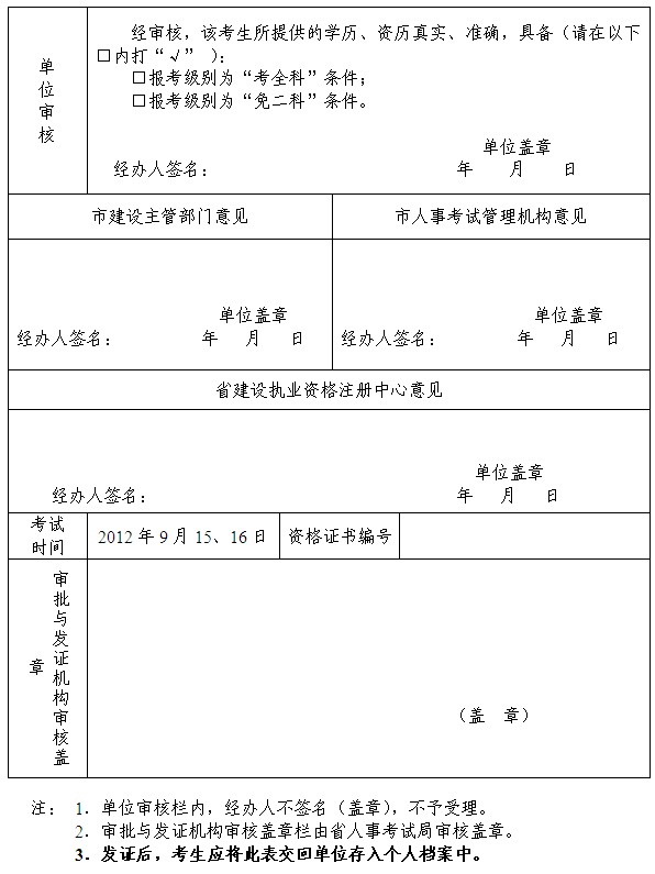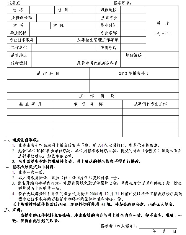 (一)《2012年度物業(yè)管理師資格考試報名發(fā)證登記表》(考生從網(wǎng)上自行下載,用A4紙雙面打印,經(jīng)單位審核蓋章)一份。