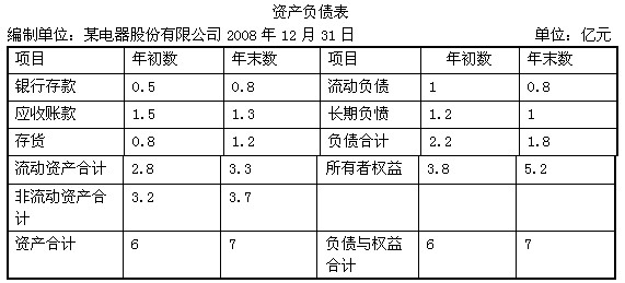 某電器股份有限公司,2008年實現銷售收入3 億元,實現凈利潤0.3 億元,公司2008年簡化資產負債表如下: