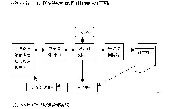 【案例3】聯(lián)想是著名的IT制造企業(yè),其采購(gòu)部門分布于北京、上海、中國(guó)香港、深圳和臺(tái)北及全球一些地區(qū),在全球聯(lián)想有300多家零件供應(yīng)商。聯(lián)想的生產(chǎn)基地分布在北京、上海和惠陽(yáng)等地區(qū),擁有5000多家國(guó)內(nèi)客戶渠道并在歐洲、美洲以及亞太設(shè)有海外平臺(tái),客戶60%~70%來(lái)自于個(gè)人和中小型企業(yè),聯(lián)想的代理商、分銷商、專賣店、大客戶和散戶等可通過(guò)聯(lián)想的電子商務(wù)網(wǎng)站下訂單,聯(lián)想然后通過(guò)ERP系統(tǒng)和綜合計(jì)劃系統(tǒng)以及采購(gòu)協(xié)同網(wǎng)站等,安排零件材料采購(gòu)、成品生產(chǎn)和物流實(shí)施等,最終實(shí)現(xiàn)客戶需求。其中聯(lián)想沒(méi)有自己的物流公司,在實(shí)施采購(gòu)物流時(shí)采取供貨商JIT送貨、聯(lián)想自己實(shí)施以及三方物流方式,在實(shí)施產(chǎn)品配送物流時(shí)則采用三方物流。請(qǐng)分析:(1)分析聯(lián)想供應(yīng)鏈管理流程;(2)分析聯(lián)想供應(yīng)鏈管理實(shí)施。