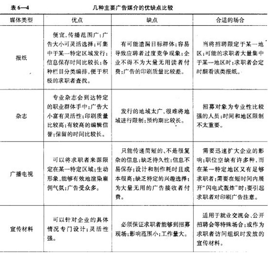 對(duì)組織有所了解,減少應(yīng)聘過(guò)程中的盲目性。缺點(diǎn)是廣告費(fèi)昂貴,招聘成本比較高。使用廣告招募人員主要需要考慮兩個(gè)方面的問(wèn)題:一是媒體選擇;二是廣告內(nèi)容設(shè)計(jì)。