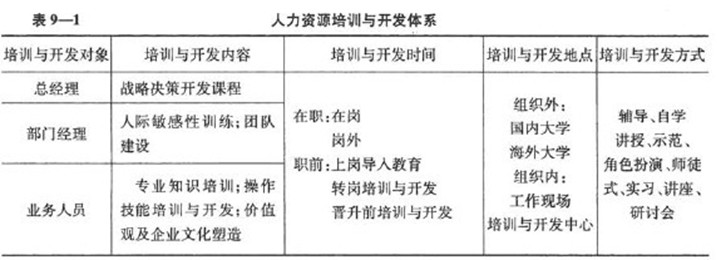 組織在對員工進行培訓(xùn)與開發(fā)時,可根據(jù)各種培訓(xùn)與開發(fā)類型和方法,按需要選用其中一種,或者選擇若干種并用或交叉應(yīng)用。由于組織的人員結(jié)構(gòu)復(fù)雜、內(nèi)部崗位繁多,技術(shù)、能力要求各不相同,組織的培訓(xùn)與開發(fā)必然是一個多層次、多內(nèi)容、多形式與多方法的體系。組織要建立起自己的一套培訓(xùn)與開發(fā)體系,就需要真正做到因需施教、因材施教、因地制宜,有效利用各種培訓(xùn)與開發(fā)資源。滿足組織的培訓(xùn)與開發(fā)需要。表9-1就是某一個組織的培訓(xùn)與開發(fā)體系。