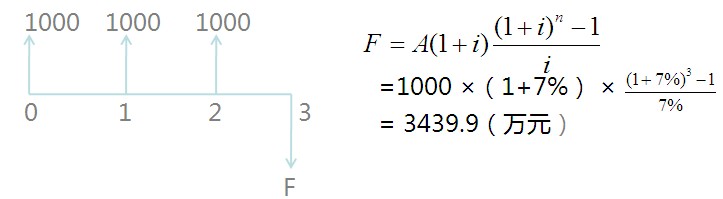 [例6-2] 某房地產(chǎn)開發(fā)企業(yè)獲得銀行一筆為期3年的分期支付的貸款,每期支付額為1 000萬元,支付期為每年年初,年貸款利率為7%,到期后一次性還本付息。問3年后該房地產(chǎn)