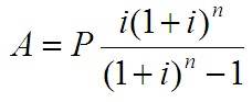 對(duì)于初始投資為P,年利率為i時(shí),在n年內(nèi)每年年末以等額資金A回收,當(dāng)A為多少時(shí),所有的回收額等值于初始投資P。這是等額分付資本回收的計(jì)算問題,它是等額分付現(xiàn)值公式的逆運(yùn)算,即已知現(xiàn)值,求與之相等值的等額年值,可由式( 6-15)得出: