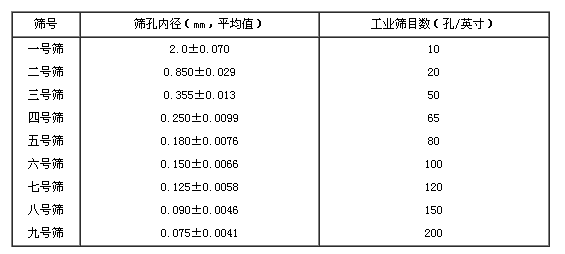 工業(yè)用篩常以目數(shù)來表示篩號,以每英寸(2.54cm)長度上有多少孔來表示。見下表。