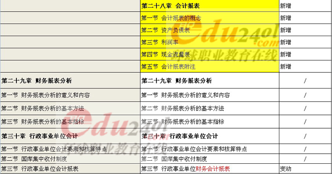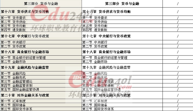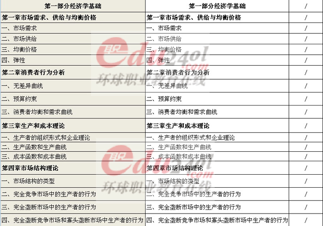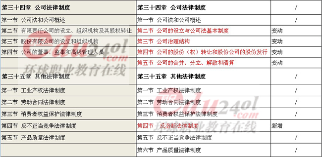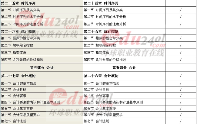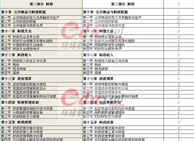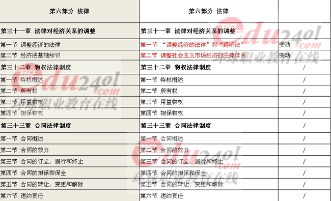 環(huán)球網(wǎng)校的小編們拿著12、13版教材的目錄進(jìn)行了一一對比。從書的目錄來看,第一部分經(jīng)濟(jì)學(xué)基礎(chǔ)、第二部分 財政、第三部分 貨幣與金融章節(jié)內(nèi)容上都沒有變化。變化最大的是第四部分統(tǒng)計,第二十四章數(shù)據(jù)特征的測度,整章刪除,增加了第二十三章相關(guān)與回歸分析,其它幾章的具體小節(jié)的內(nèi)容也都有不小的變動。第二十一章 統(tǒng)計與統(tǒng)計數(shù)據(jù)、第二十二章 統(tǒng)計調(diào)查,具體的小節(jié)內(nèi)容全部都變了。第五部分會計,增加了一個章節(jié),第二十八章會計報表。第六部分法律,第三十四章公司法律制度,變動較大,除了第一小節(jié)其余小節(jié)的內(nèi)容都變了。第三十五章其他法律制度,增加了第四節(jié)反壟斷法律制度。13版的教材最后依然是一套模擬試題,本套題部分題和12年的模擬題是一樣的題目。