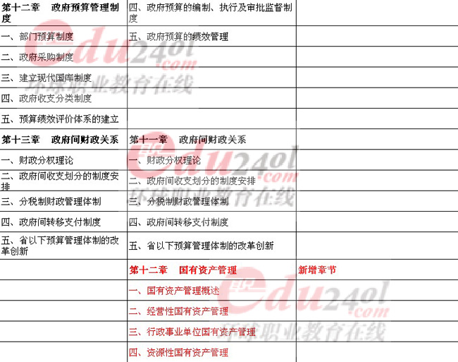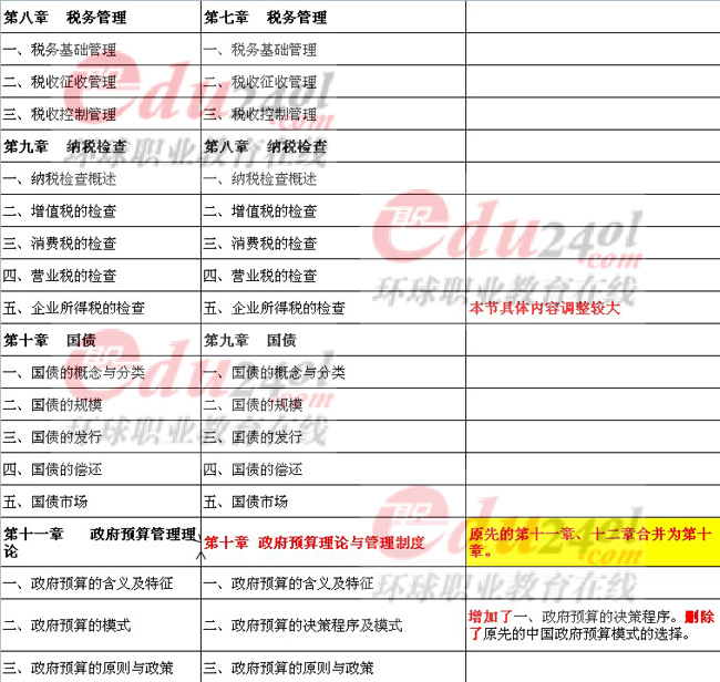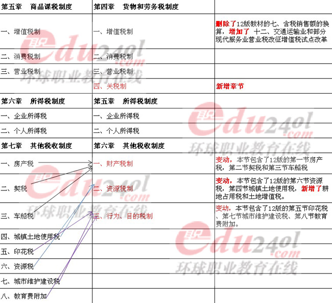 整體來書,今年財(cái)稅的教材的最大變動就是調(diào)整了一些章節(jié)的排列順次,例如,13年的新教材的第二章財(cái)政支出理論與內(nèi)容就是合并了原來教材的第二章和第三章的內(nèi)容,第六章其它稅收制度,將原本的八節(jié)的內(nèi)容合并為現(xiàn)在的三節(jié),當(dāng)然也加入了一些新的內(nèi)容。當(dāng)然也還有個別章節(jié)的內(nèi)容進(jìn)行了一些變動,例如第一章公共財(cái)政與財(cái)政職能第一節(jié)公共產(chǎn)品與公共財(cái)政理論,刪除了構(gòu)建我國公共財(cái)政體系這部分的內(nèi)容。具體各章節(jié)的變動請看下表。