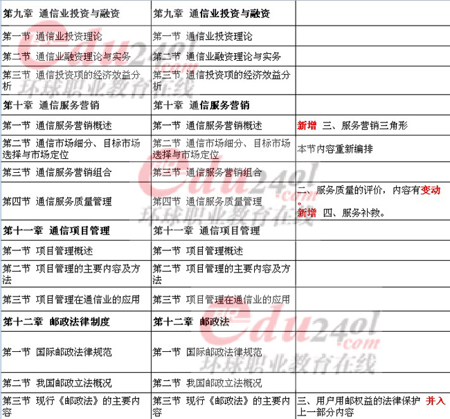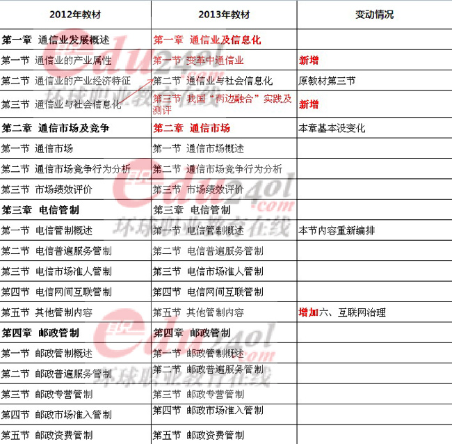 2013年經(jīng)濟(jì)師郵電經(jīng)濟(jì)專業(yè)知識(shí)與實(shí)務(wù)(中級(jí))的教材千呼萬喚終于出版了,知道大家急迫的心情,所以拿到教材的環(huán)球網(wǎng)校的小編們第一時(shí)間進(jìn)行了教材的對比分析,希望可以對大家的復(fù)習(xí)有所幫助。