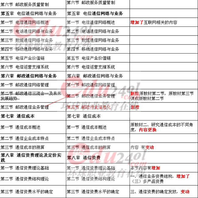 總得來說,今年郵電的教材變化不算太大,基本上都是原章節(jié)一些具體的內(nèi)容的調(diào)整,如第八章 通信資費(fèi)、第二節(jié) 通信資費(fèi)結(jié)構(gòu)理論,一、通信業(yè)務(wù)資費(fèi)結(jié)構(gòu),增加了(三)多產(chǎn)品資費(fèi)。還有就是增加了關(guān)于互聯(lián)網(wǎng)的內(nèi)容,如第三章 電信管制、第五章 電信通信網(wǎng)絡(luò)與業(yè)務(wù)都有互聯(lián)網(wǎng)相關(guān)知識(shí)的加入。當(dāng)然,今年的新教材也有新增的內(nèi)容,不過大章是沒有增加的,都是小節(jié)的增加,例如第一章 通信業(yè)及信息化增加了第三節(jié) 我國“兩邊融合”實(shí)踐及測評;第十三章 電信法律制度增加了第四節(jié) 實(shí)施《電信條例》的相關(guān)配套法規(guī)等等。具體的變化情況請?jiān)斠娤卤怼?/p>