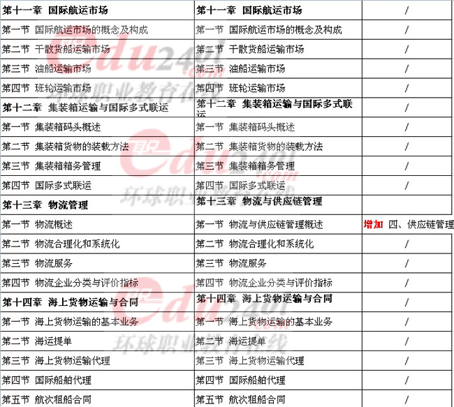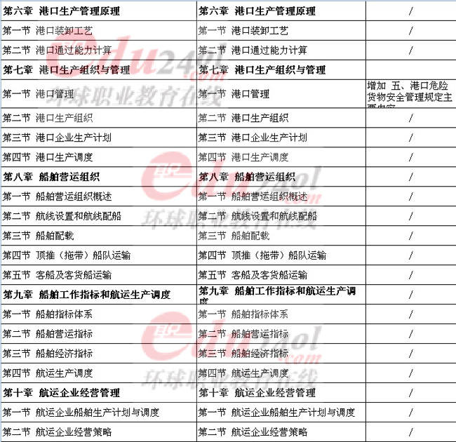 總得來說,今年水路的教材相較于公路和鐵路來說變化時最小的。第五章 國際航運融資由原來的兩節(jié)變?yōu)楝F(xiàn)在的五節(jié),但是并不是增加了多少內(nèi)容,更多的是講原來的兩節(jié)重新的編排了一下。第七章 港口生產(chǎn)組織與管理,第一節(jié) 港口管理增加了港口危險貨物安全管理規(guī)定主要內(nèi)容。第十三章 物流與供應(yīng)鏈管理,第一節(jié) 物流與供應(yīng)鏈管理概述增加了供應(yīng)鏈管理。當(dāng)然還有一些變化都是一些遣詞造句方面的變化,中心的內(nèi)容其實都沒有變化。具體的變化情況請詳見下表。