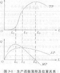 在勞動投入在L1和L3之間時,勞動的邊際產量遞減,但為正數,所以總產量是以遞減的速度增加。從圖形上看,總產量曲線向上傾斜,但斜率遞減,即凹向L軸。