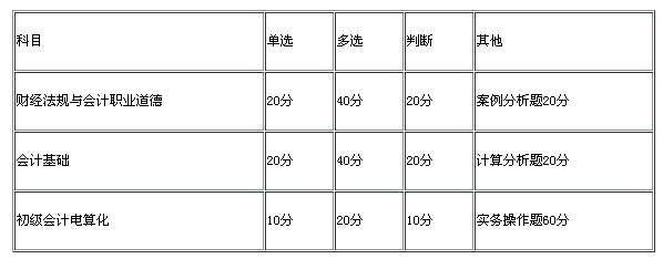 會(huì)計(jì)從業(yè)資格無(wú)紙化考試三個(gè)科目滿分均為100分,及格分均為60分。每門科目各題型的分值如下表: