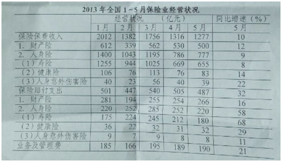 115、關(guān)于2013年1~5月保險(xiǎn)業(yè)經(jīng)營(yíng)狀況,能夠從上述資料中推出的是: