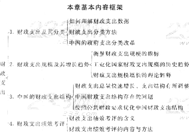 本章主要講述財(cái)政支出分類、財(cái)政支出規(guī)模和增長理論、我國財(cái)政支出結(jié)構(gòu)、財(cái)政支出績效考評等基本內(nèi)容。