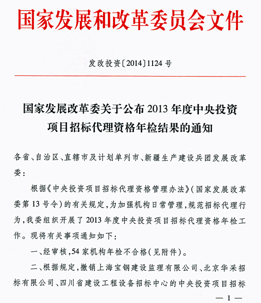 2013年中央投資項目招標代理資格年檢結(jié)果公布