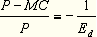 即:一個(gè)壟斷企業(yè)索取的價(jià)格超過(guò)邊際成本的程度,受制于需求價(jià)格彈性。彈性低,壟斷者可以確定較高的價(jià)格;隨著需求價(jià)格彈性增高,則價(jià)格將逐漸接近于邊際成本。