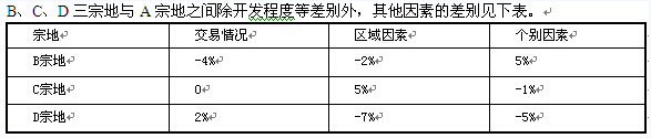 相對(duì)A宗地而言,其50年土地使用權(quán)價(jià)格因于發(fā)程度不同而有差異:達(dá)到“七通一平,,時(shí)地價(jià)比“五通一平”高100元/┫,達(dá)到“五通一平’’時(shí)地價(jià)比“三通一平”高60元/┫。根據(jù)以上資料,回答51~55小題的問題。