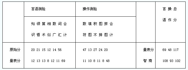 三 實(shí)施步驟:①填寫好被試者的一般情況,測(cè)驗(yàn)時(shí)間,地點(diǎn)和主測(cè)人②測(cè)驗(yàn),一般按先言語(yǔ)測(cè)驗(yàn)后操作測(cè)驗(yàn)的順序進(jìn)行;言語(yǔ)有困難的可先做操作;一次無法完成可分次進(jìn)行。