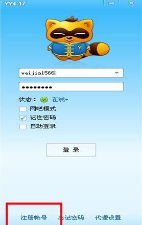 6、安裝完成后彈出yy列表,請(qǐng)點(diǎn)擊左下角“注冊(cè)賬號(hào)”