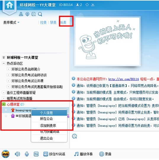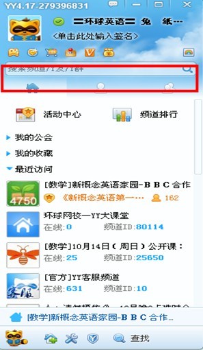 登陸后,在標(biāo)紅搜索框中,搜索頻道:80114,并進(jìn)入“環(huán)球網(wǎng)校-yy大講堂”,進(jìn)入后雙擊“心理講堂”,即可進(jìn)入直播。進(jìn)入頻道后,還可以點(diǎn)右上角的五星☆進(jìn)行收藏。
