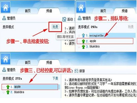 (1)、 搶麥 管理員將頻道模式變?yōu)辂溞蚰J剑瑢W(xué)員可發(fā)言講話; 步驟一:點(diǎn)擊搶麥按鈕,進(jìn)入麥序隊(duì)列; 步驟二:排隊(duì)等待發(fā)言;步驟三:已經(jīng)控麥,可以講話。