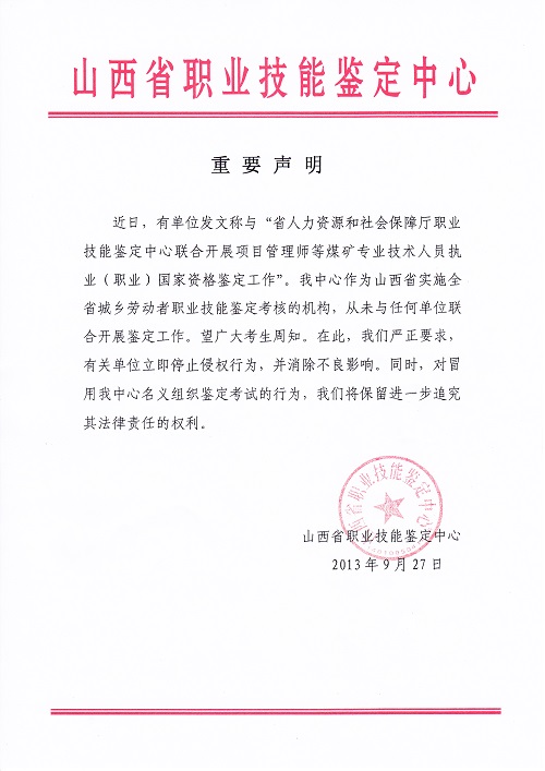 摘要 山西省職業(yè)技能鑒定中心未與任何單位聯(lián)合開展鑒定工作的聲明