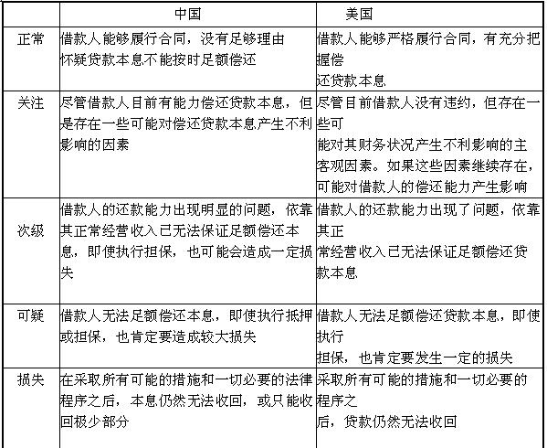 我國(guó)貸款風(fēng)險(xiǎn)分類(lèi)的標(biāo)準(zhǔn)有一條核心的內(nèi)容,即貸款償還的可能性。在市場(chǎng)約束和法制健全的情況下,借款人的還款能力幾乎是唯一重要的因素。還款能力還是占主導(dǎo)地位的因素。這種差異,通過(guò)比較中美兩國(guó)貸款分類(lèi)的核心定義可以看出來(lái)(見(jiàn)表11 -1)。