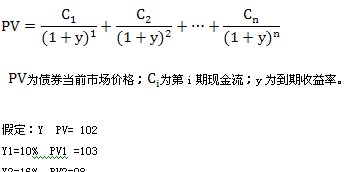 到期收益率:是指投資購(gòu)買(mǎi)債券的內(nèi)部收益率,即可以使投資購(gòu)買(mǎi)債券獲得的未來(lái)現(xiàn)金流量的現(xiàn)值等于債券當(dāng)前市場(chǎng)價(jià)格的貼現(xiàn)率。