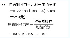 【例題】張先生去年初以每股25元的價(jià)格購買了100股中國移動(dòng)的股票,過去一年中得到每股0.2元的紅利,年底時(shí)以每股30元的價(jià)格出售,其持有期收益和收益率分別為多少?