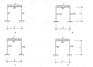 提示:圖示超靜定剛架中,B圖橫梁與豎桿的剛度比最大,故其橫梁跨中彎矩最大。