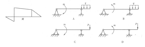 提示:A、B圖中均布荷載不可能產(chǎn)生圖示彎矩。而C圖中由受力分析可知左端支點(diǎn)反力應(yīng)向下,也不可能產(chǎn)生圖示彎矩。只有D圖才是正確的。