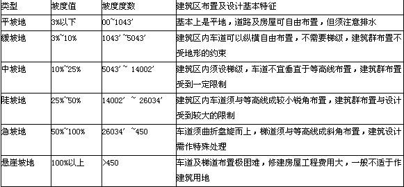 地形指地表面起伏的狀態(tài)(地貌)和位于地表面的所有固定性物體(地物)的總體,主要是采用等高線來(lái)表示地形。地形圖上相鄰兩條等高線之間的水平距離稱(chēng)為等高線間距,其疏密反映了地面坡度的緩與陡。根據(jù)坡度的大小,可將地形劃分為六種類(lèi)型,地形坡度的分級(jí)標(biāo)準(zhǔn)及與建筑的關(guān)系見(jiàn)表1--1。