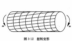 當(dāng)桿件受一對轉(zhuǎn)向相反,作用在垂直于桿軸線的兩個平面內(nèi)的外力偶作用時,桿件將發(fā)生扭轉(zhuǎn)變形(圖 3 一12 )。