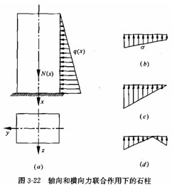 石柱任一截面上的內(nèi)力有軸力(壓力)、彎矩和剪力。軸力使截面產(chǎn)生均勻的壓應(yīng)力,彎矩使截面左半部分產(chǎn)生壓應(yīng)力,右半部分產(chǎn)生壓拉力。這樣整個截面在左側(cè)邊緣處壓應(yīng)力最大,而在右側(cè)邊緣處壓應(yīng)力最小(圖 3 -22b、c);當(dāng)然,如果側(cè)向荷載比較大的話,右側(cè)邊緣附近的正應(yīng)力可能轉(zhuǎn)化為拉應(yīng)力(圖3 -22d )。