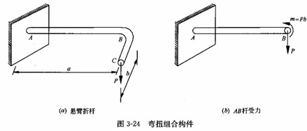 圖 3 -24 ( a )所示為一端固定另一端自由的折桿,自由端 C 處作用一豎向集中荷載P。取 AB 桿進行分析(圖 3 -24b ) ,此時 B 端的作用力為一豎向集中力P和一力偶m= Pb 。力偶 m 的作用面垂直于 AB 桿軸線,故為一扭矩,因此 AB 桿屬于彎曲和扭轉的組合變形情況。