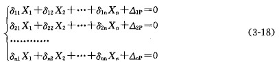 ( 3 )根據(jù)基本結(jié)構(gòu)在多余力和原有荷載共同作用下,多余力作用點沿其作用方向的位移與原結(jié)構(gòu)相應位移相等的條件,建立 n 個關(guān)于多余未知力的方程,即力法典型方程如下: