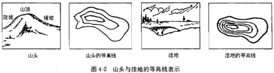 山頭與洼地的等高線皆是一組閉合曲線;在地形圖上區(qū)分山頭或洼地的準(zhǔn)則是:凡內(nèi)圈等高線的高程注記大于外圈者為山頭,小于外圈者為洼地。如果等高線上沒有高程注記,則常用示坡線表示。示坡線就是一條垂直與等高線而指向下坡滑方向的細(xì)短線。參見圖4―2所示。