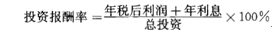 投資報酬率是指項目建成投產(chǎn)后正常生產(chǎn)年份的年稅后利潤和年借款利息之和與項目總投資的比率,其計算公式為:
