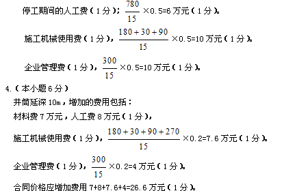(3)因設(shè)計(jì)變更,井筒延深1Om。延深所需材料費(fèi)7萬(wàn)元,人工費(fèi)8萬(wàn)元,工期0.2個(gè)月(原設(shè)備均滿足要求)。