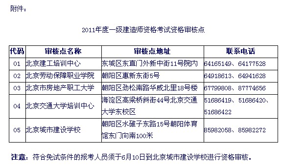 3、持《資格審核表》、本人身份證明(身份證、軍官證、機動車駕駛證、護照,下同)、學歷證書、學位證書,符合免試條件的報考人員還需提供資質證書、高級專業(yè)技術職務證書,參加“一級建造師相應專業(yè)考試”的報考人員還需提供一級建造師執(zhí)業(yè)資格證書(上述證書均為原件),于2011年6月8日至10日從附件中所列資格審核地點中選擇一處進行資格審核;