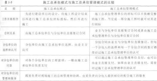 施工總承包模式與施工總承包管理模式的比較見表1―5。