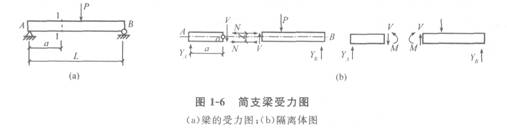 (1) 梁在荷載作用下的內(nèi)力:圖1-6為一簡(jiǎn)支梁。梁受彎后,上部受壓,產(chǎn)生壓縮變形;下部受拉,產(chǎn)生拉伸變形。V為1―1截面的剪力,∑Y=0,V=YA。1 ―1截面上有一拉力N和一壓力N,形成一力偶M,此力偶稱1―1截面的彎矩。根據(jù)∑M0=0,可求得M=YA?a。梁的截面上有兩種內(nèi)力,即彎矩M和剪力 V。