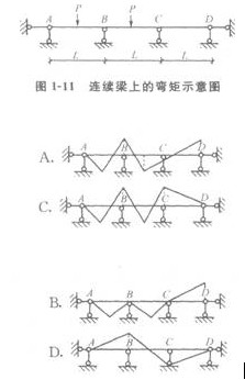 【2009年度考試真題】 有一連續(xù)梁,受力如圖1―11所示,則下列連續(xù)梁上的彎矩示意圖中,正確的是( )。 【答案】C本題考核的是連續(xù)梁的彎矩圖。連續(xù)梁、板的受力特點(diǎn)是:跨中有正彎矩,支座有負(fù)彎矩。 【2006年度考試真題】 1.一個(gè)質(zhì)量為w的物體,通過(guò)兩根繩索AC和BC懸吊如圖1―12所示。下列四種情況下, 繩索AC拉力最大的是( )。
