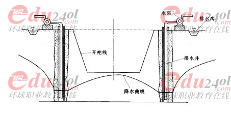 答:管井降水,是在基坑周圍布置一些單獨(dú)工作的管井,地下水在重力作用下流入井中,用抽水設(shè)備將水抽走(見圖17.1)。