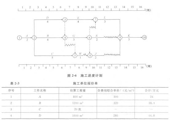 某工程的施工合同工期為16周,項(xiàng)目監(jiān)理機(jī)構(gòu)批準(zhǔn)的施工進(jìn)度計(jì)劃如圖2-6所示(時(shí)間單位:周)。各工作均按勻速施工。施工單位的報(bào)價(jià)單(部分)見(jiàn)表2-3。