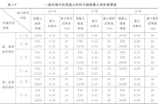 一般環(huán)境中的配筋混凝土結(jié)構(gòu)構(gòu)件,其普通鋼筋的保護(hù)層最小厚度與相應(yīng)的混凝土強(qiáng)度等級(jí)、最大水膠比應(yīng)符合表1-5的要求。