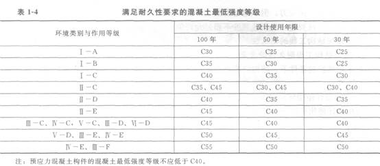 結(jié)構(gòu)構(gòu)件的混凝土強(qiáng)度等級(jí)應(yīng)同時(shí)滿足耐久性和承載能力的要求,故《混凝土結(jié)構(gòu)耐久性設(shè)計(jì)規(guī)范》(GB/T50476-2008)中對(duì)配筋混凝土結(jié)構(gòu)滿足耐久性要求的混凝土最低強(qiáng)度等級(jí)作出相應(yīng)規(guī)定,見(jiàn)表1―4。