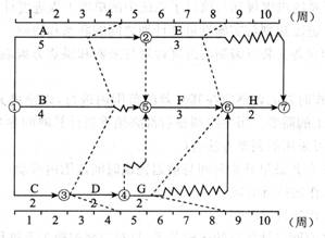 83.某分部工程時(shí)標(biāo)網(wǎng)絡(luò)計(jì)劃如下圖所示,檢查實(shí)際進(jìn)度如圖中前鋒線所示,該圖表明( )。