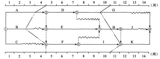 86.下圖所示的工程雙代號時標網(wǎng)絡計劃,執(zhí)行到第4周末及第10周末時,檢查其實際進度如圖中前鋒線所示,檢查結(jié)果表明( )。
