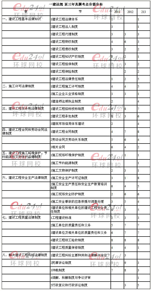 作為一級建造師的考試科目,《建設(shè)工程法規(guī)及相關(guān)知識》可謂是其中最基礎(chǔ)的一科,同時也是相當(dāng)重要的一門。而法規(guī)這個科目的特點是知識點繁多,因此復(fù)習(xí)起來也是比較麻煩。環(huán)球網(wǎng)校的小編為了幫助大家能夠更好的復(fù)習(xí),特地幫大家整理了2011年到2013年各章節(jié)占取的分值,希望能夠幫助大家確定重點,方便復(fù)習(xí)。